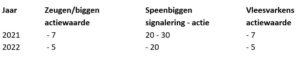 Let op: de benchmarkwaarden worden per 1 januari 2022 aangescherpt voor alle diercategorieën (zie onderstaande tabel). Bij alle categorieën wordt dan gewerkt met slechts één benchmarkwaarde, het oranje gebied verdwijnt dus. De dierdagdosering van het bedrijf is inzichtelijk via het portaal van jouw IKB-organisatie. Controleer deze op tijd, zodat je weet of er mogelijk actie ondernomen moet worden.