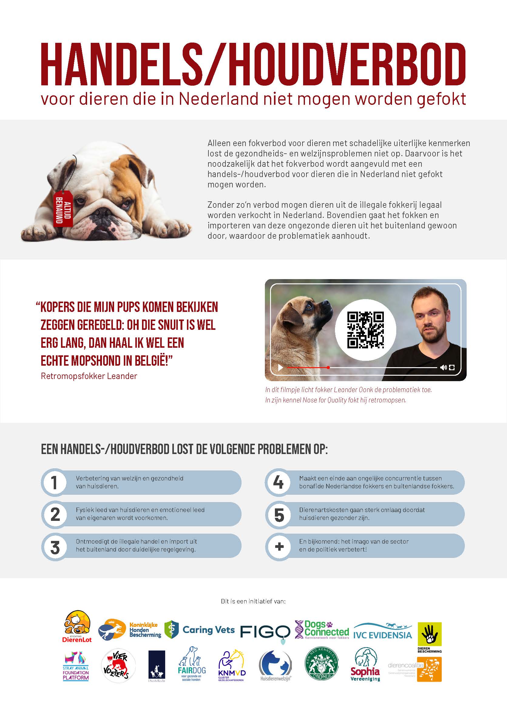 Dieren met bepaalde schadelijke uiterlijke kenmerken, zoals extreme brachycephale honden, mogen in Nederland niet meer gefokt worden. Zolang er echter niet ook een handels- en houdverbod komt, mogen dergelijke dieren uit illegale fokkerij of gefokt in en geïmporteerd uit het buitenland gewoon legaal verkocht worden. En blijven de gezondheids- en welzijnsproblemen bestaan.