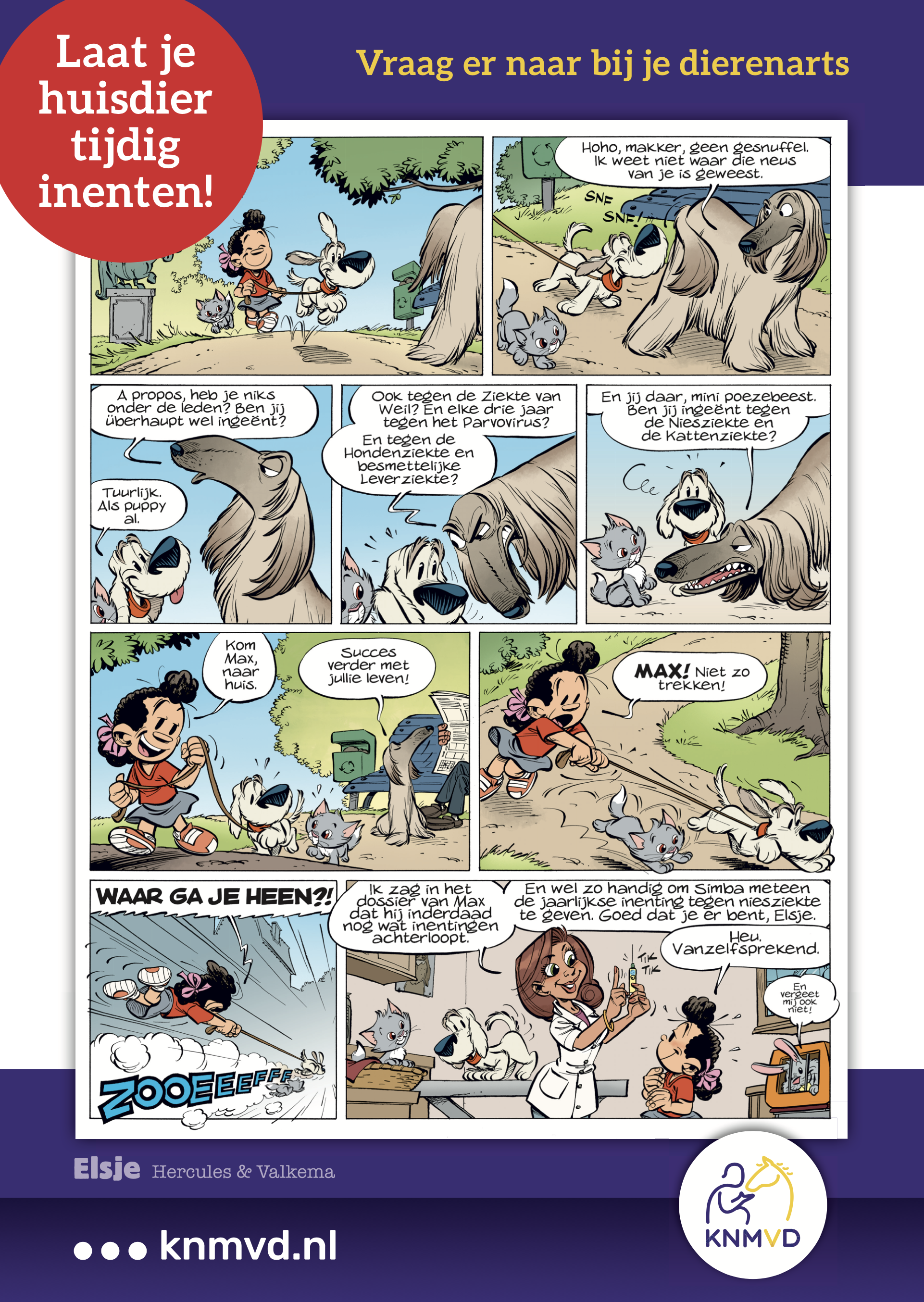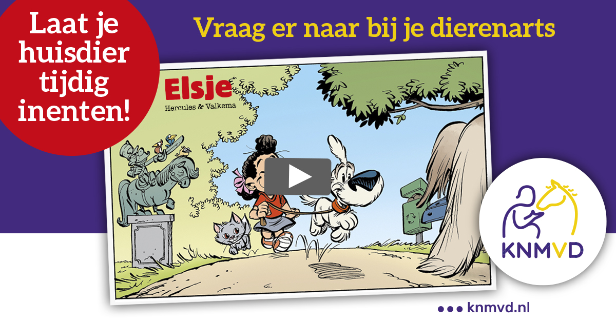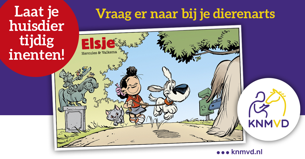 De KNMvD ontwikkelde ‘Elsje’ om meer baasjes met hun huisdieren voor een vaccinatie naar de dierenarts te laten gaan. Doe je mee met onze bewustwordingscampagne, bijvoorbeeld via je eigen social media? Download dan het materiaal onderaan de pagina. Samen staan we sterk voor diergezondheid, volksgezondheid en dierenwelzijn!